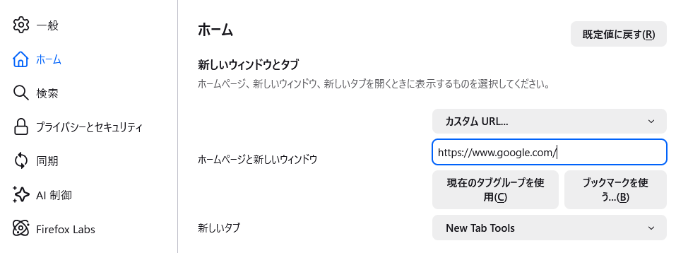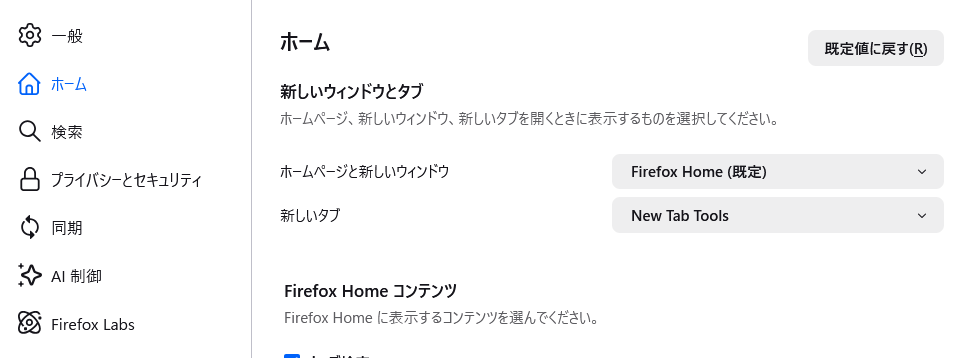 設定 → ホーム → 「亜らしいウインドウとタブ」から「ホームページと新しいウインドウ」の「Firefox Home(規定)」を変更します。