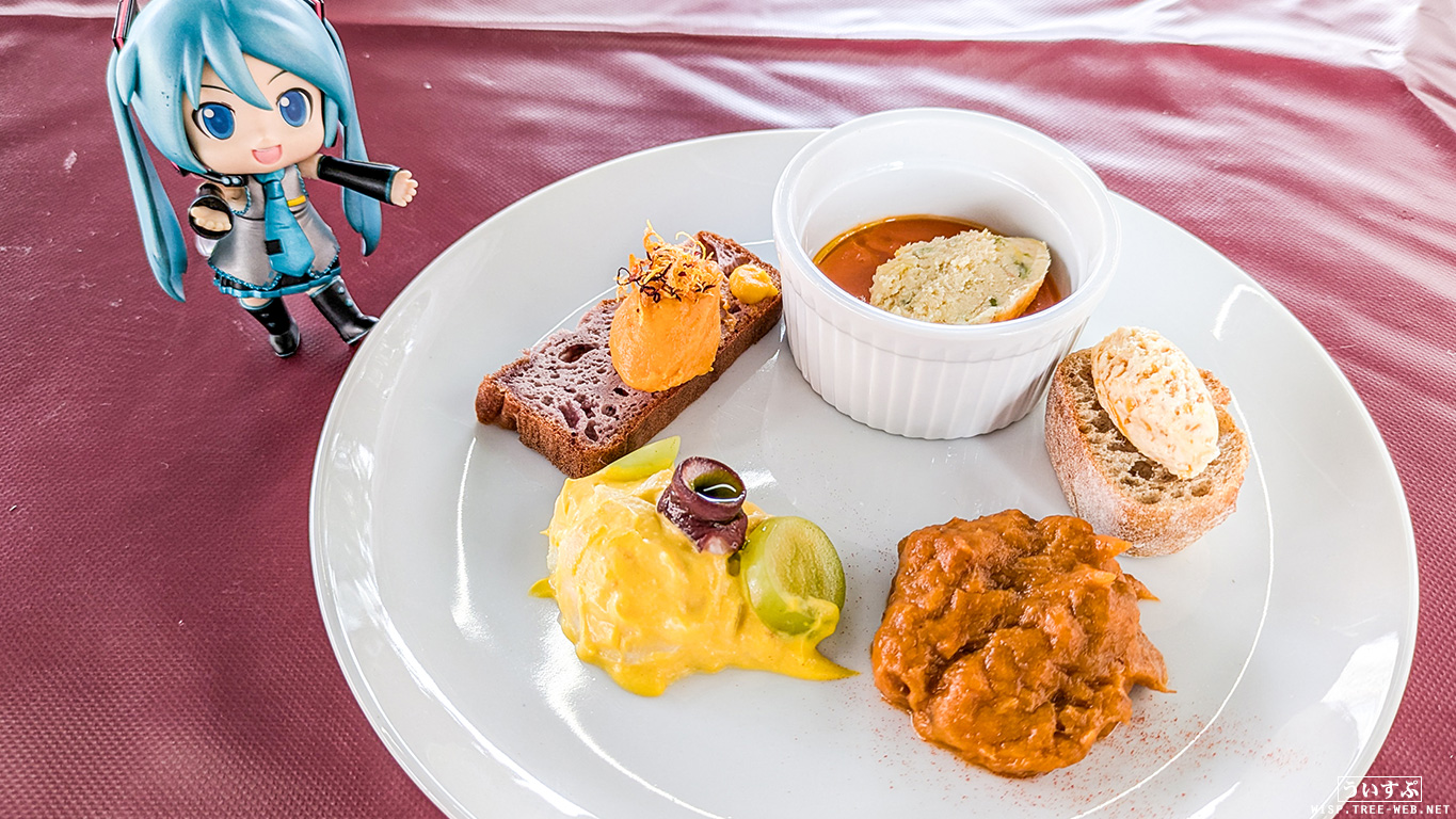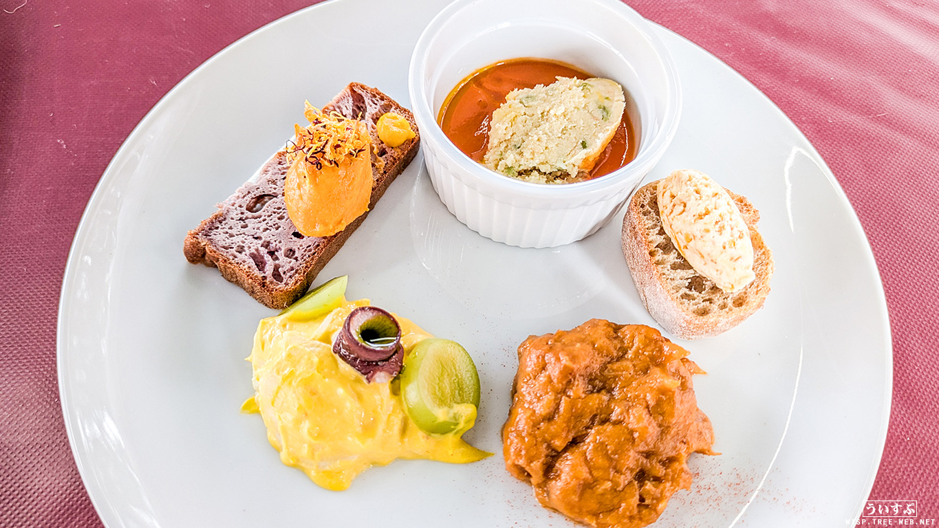 今回チョイスしたメニューは、「北海道農園 前菜4種盛り合わせ キタノカオリバケット添え」と「恵庭産ENIWARISSO豚肉と黒田農園『栗かぐや』さつま芋のベッコフタルトフランベ仕立て」です。