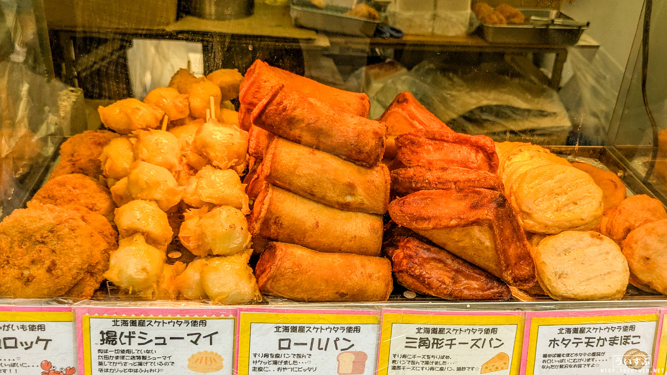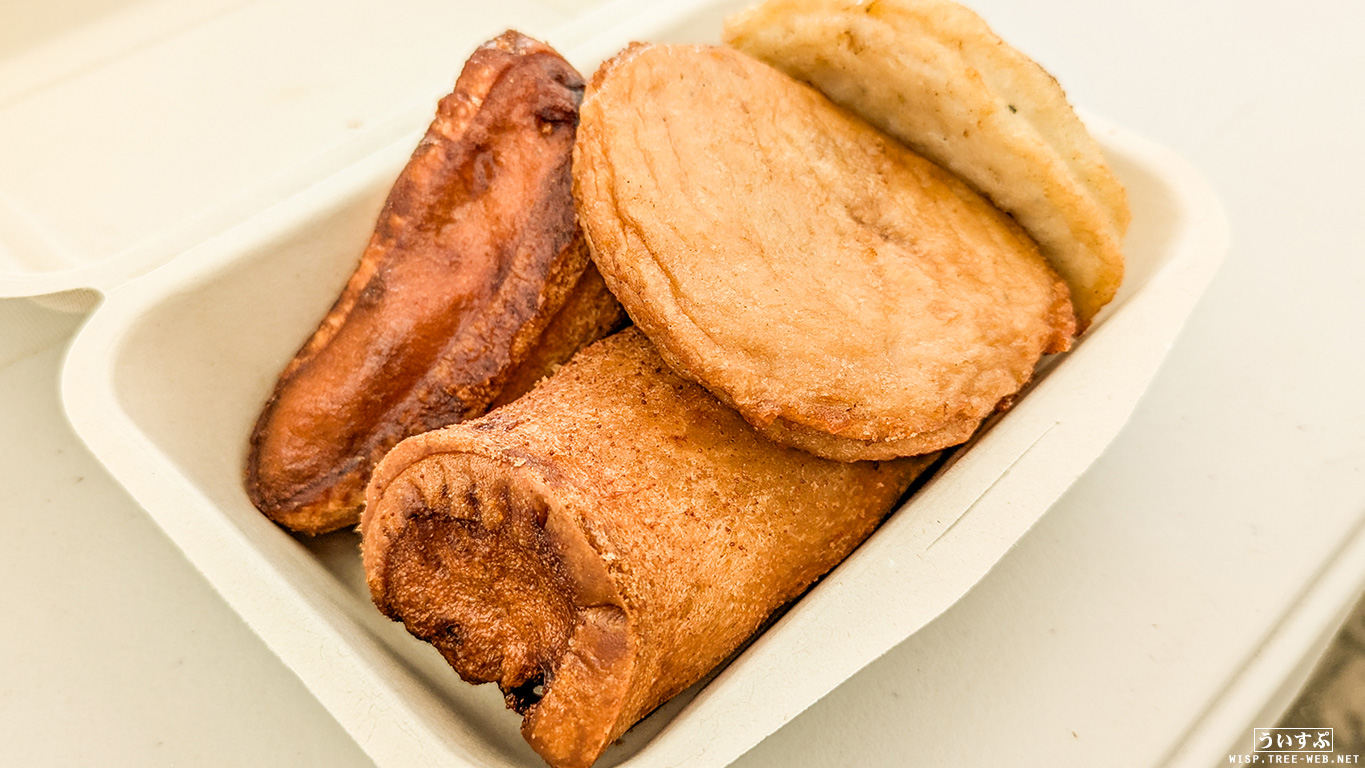 ロールパン、三角チーズパン、ホタテ天かまぼこ、イカ天かまぼこの4種です。