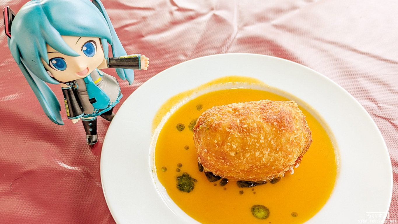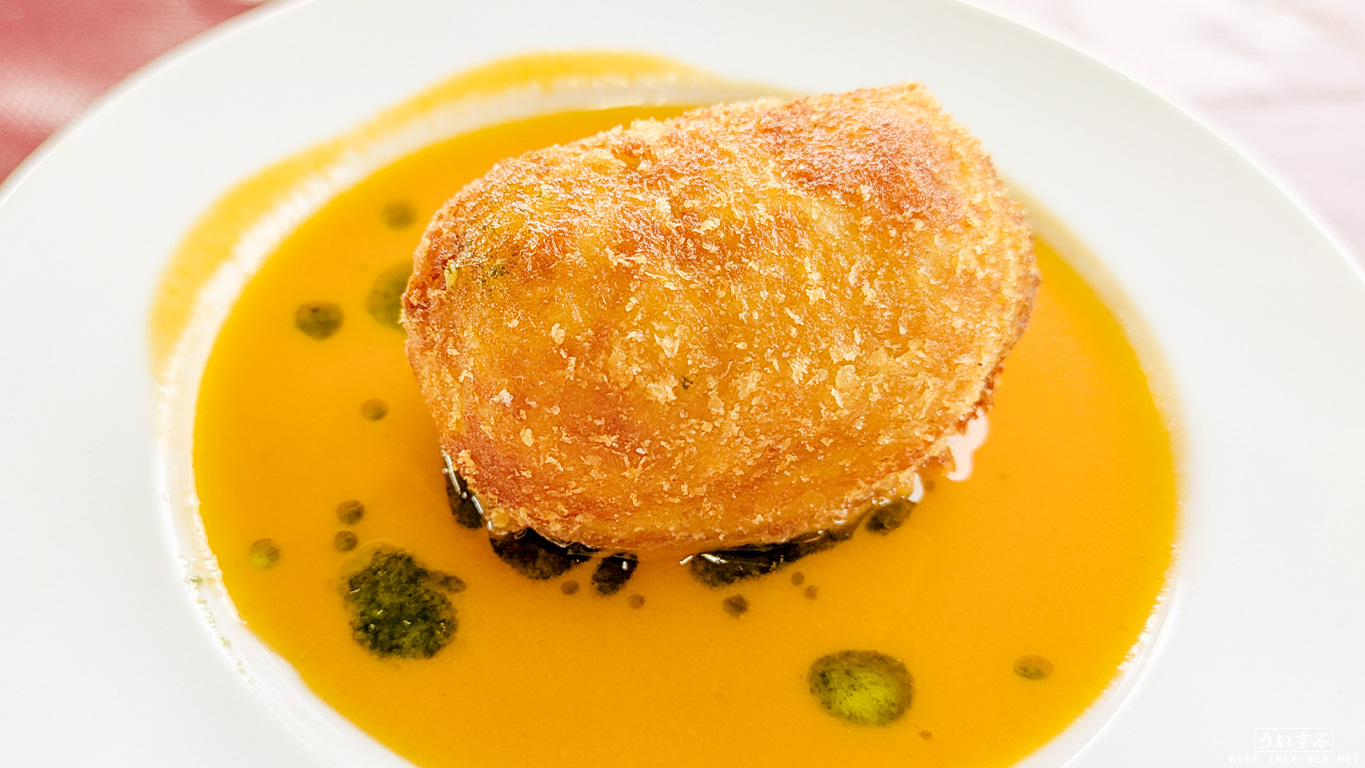 クロケット(コロッケ)は、タラの身が入っているのでさっぱりなのに味がしっかりしておりました。酸味のあるトマトが味を引き立てています。