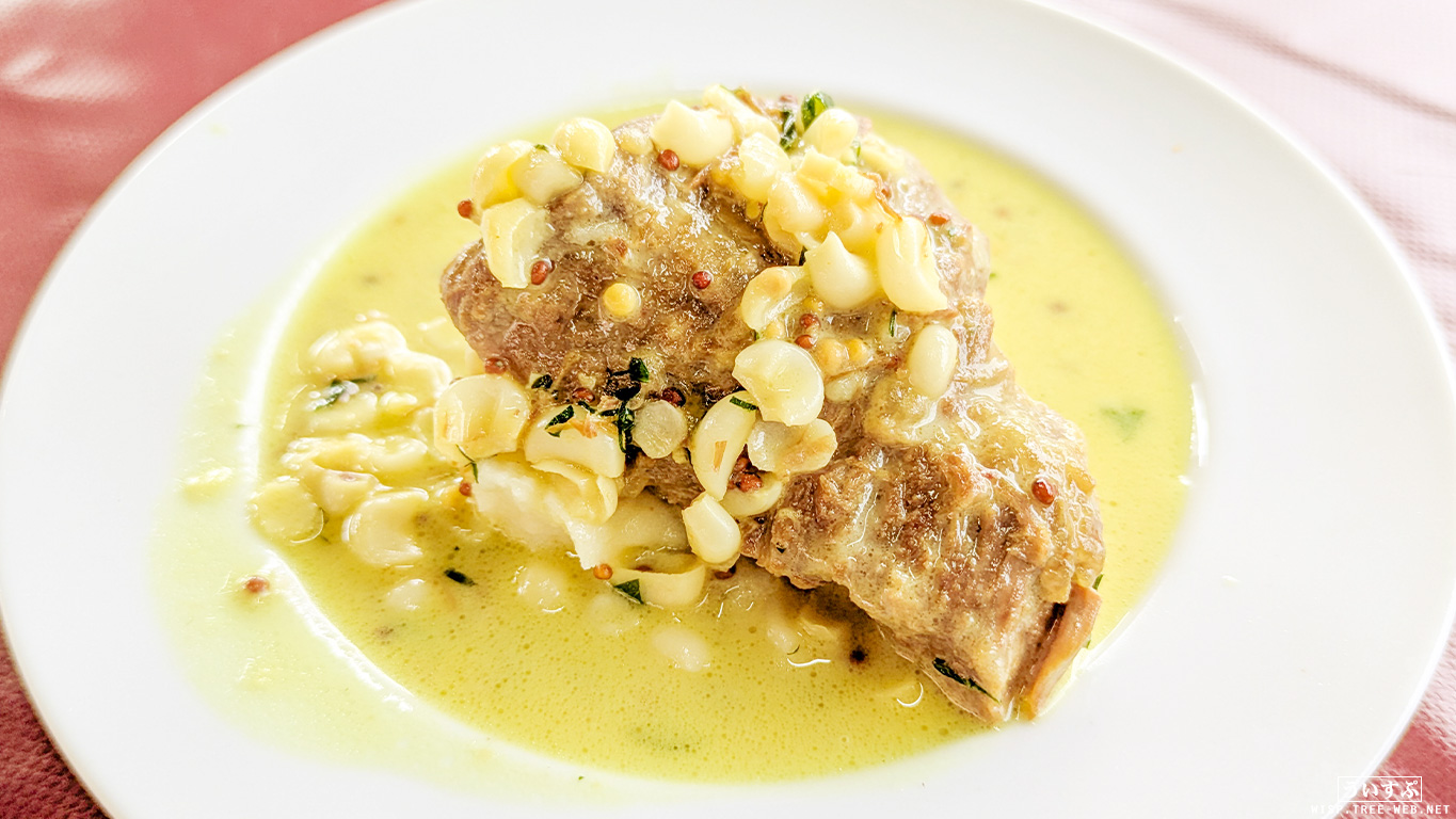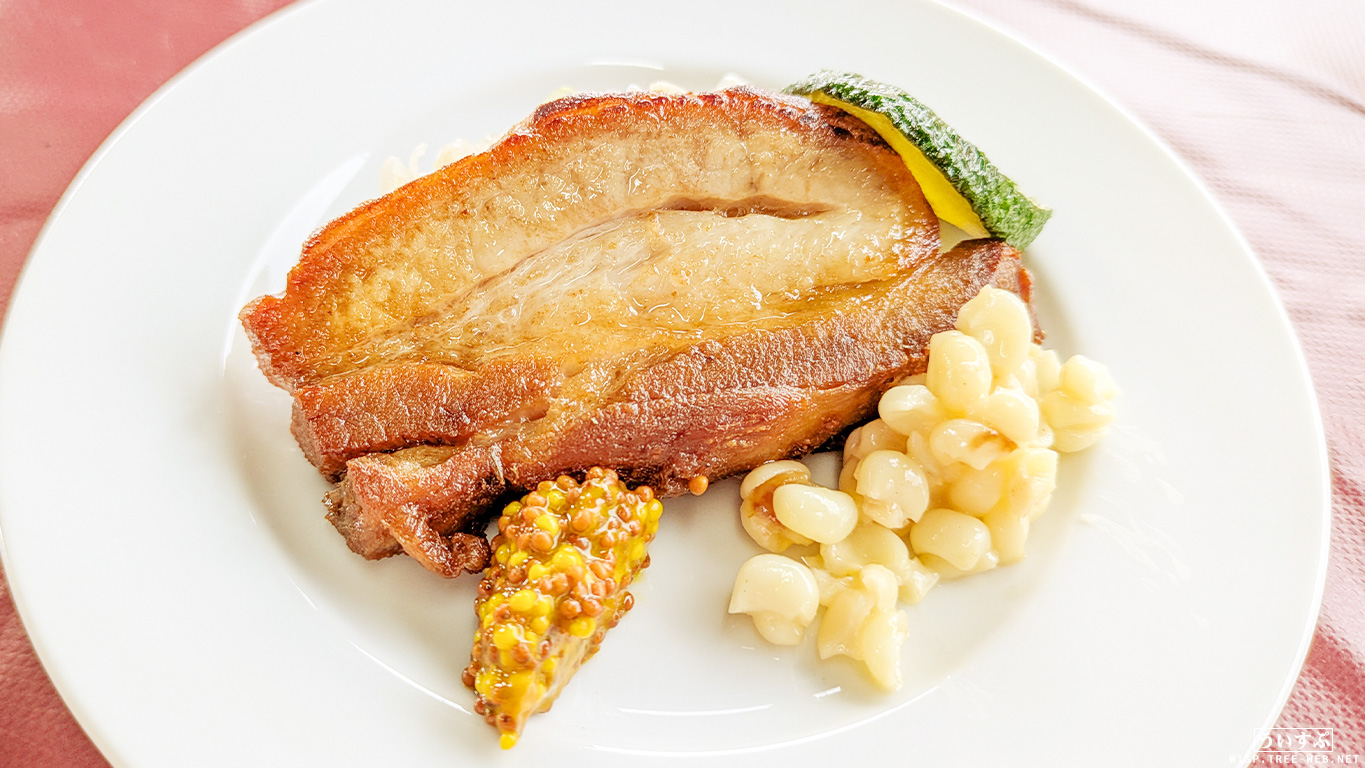 「上富良野ポークパラ肉のコンフィと富良野産キャベツの酢漬け自家製マスタード」はしっかりお肉を感じるメニューで、付け合せのマスタードがぴりりと効いてて良かったです。