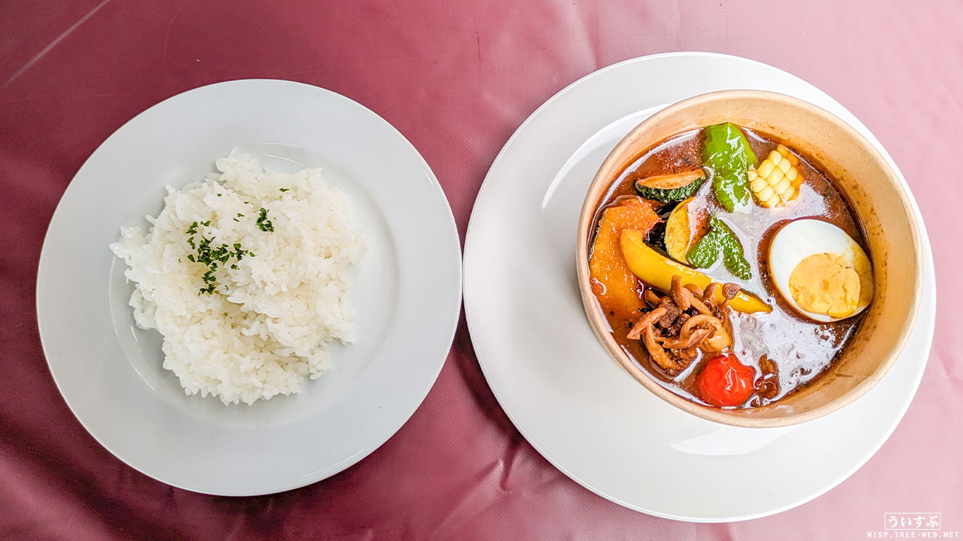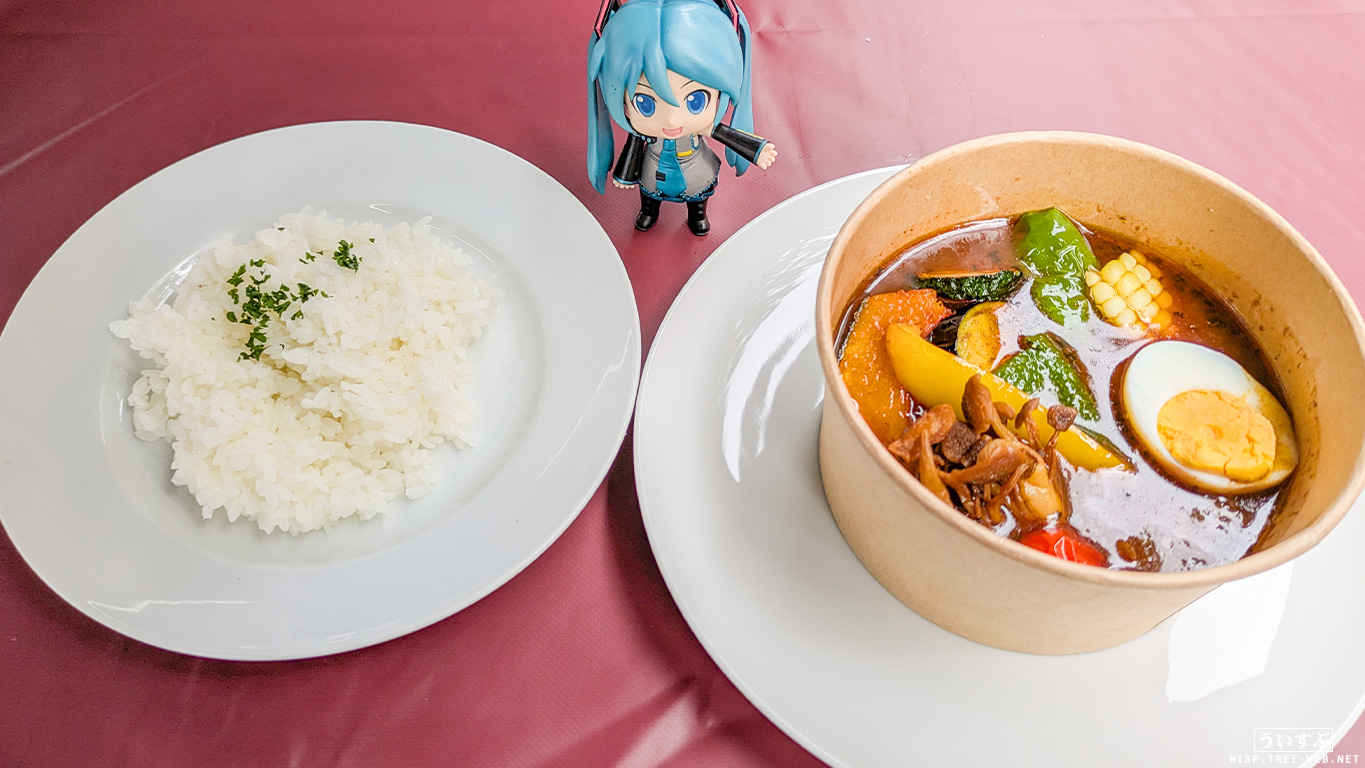 「北海道産 蝦夷鹿肉とたっぷり道産野菜のスープカレー、道産ななつぼし」
