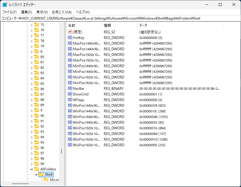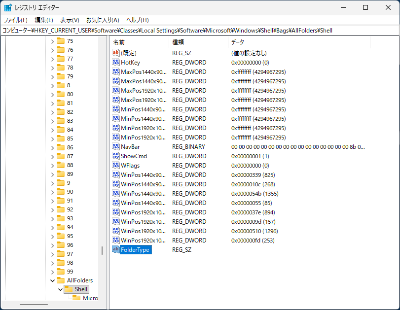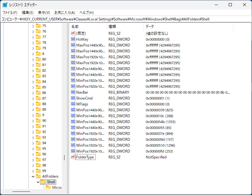 1)「HKEY_CURRENT_USER\Software\Classes\Local Settings\Software\Microsoft\Windows\Shell\Bags\AllFolders\Shell」へ移動します。