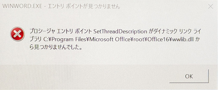 5日ごろからMicrosoft Wordを起動しようとすると、「MS OfficeのWordだけ「プロシージャ エントリ ポイント Set ThreadDescription がダイナミック C:\Program Files Microsoft Office\root\Office16\wwwlib.dll から見つかりませんでした。」がでて起動しない。」
