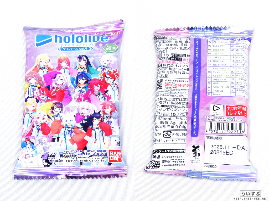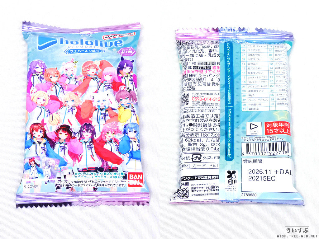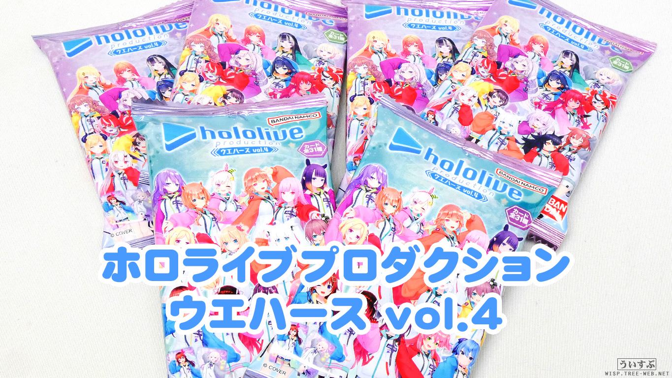 少し前に発売された「ホロライブプロダクション ウエハース vol.4」です。コンビニやドン・キホーテで見かけて購入しました。