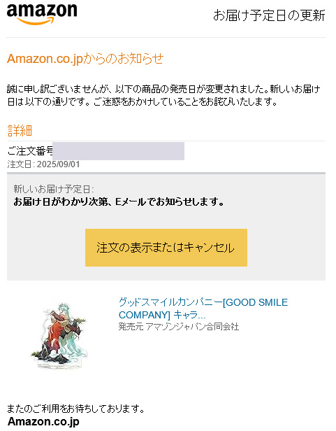 発送が遅れるとの連絡が来て、おっとー???ってなりながら、メーカーページを検索したりすると、出荷情報に掲示されていたので、あーこれはアレだなと思いつつ放置していましたら、やっぱりと言った感じです。