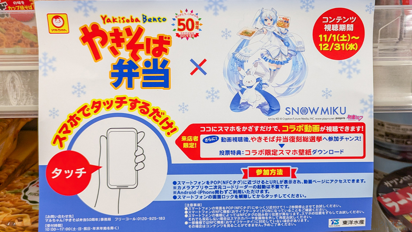 11月1日より12月末まで「マルちゃん やきそば弁当」と雪ミクのコラボキャンペーンが行われております。ポップが出ているのは知っていたのですが、伺ったスーパーには見つけることができず、モヤモヤしていた日々を過ごしていたのですが、たまたま伺った新札幌のにある生協で見つけることができました!焼きべんのあの歌を初音ミクが歌ってくれました!動画を見終わると、「やきそば弁当 復刻総選挙」に投票可能です。ポップ [...]